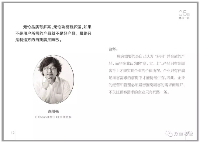 無論品質(zhì)有多高,無論功能有多強(qiáng),如果不是用戶所需的產(chǎn)品就不是好產(chǎn)品,最終只是制造方的自我滿足而已。——森川亮