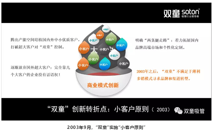 2003年9月,“雙童”實(shí)施“小客戶原則”,通過(guò)商業(yè)模式改革,改變了原來(lái)薄利多銷的粗放經(jīng)營(yíng)模式,通過(guò)獨(dú)樹(shù)一幟的銷售創(chuàng)新形成差異化錯(cuò)位競(jìng)爭(zhēng),逐漸遠(yuǎn)離同行之間惡性競(jìng)爭(zhēng),在持續(xù)積累下獲得全球吸管產(chǎn)業(yè)話語(yǔ)權(quán)和規(guī)則制定權(quán)。