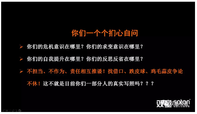 “雙童”樓仲平圍繞《危機(jī)重重下“雙童”路在何方?——“向死而生”我們只有六個(gè)月!》主題,通過(guò)兩個(gè)多小時(shí)的深入分享,讓行政員工們意識(shí)到“雙童”目前存在的嚴(yán)重問(wèn)題,引導(dǎo)大家認(rèn)識(shí)自我、反思批判,打開(kāi)思想的缺口!