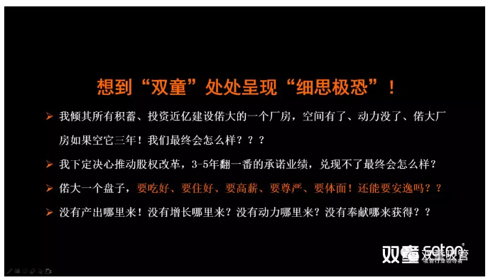 或許,大家覺(jué)得“雙童”發(fā)展的很好,為什么會(huì)“死”?為什么離“死亡”只有六個(gè)月?為什么時(shí)隔七年(2011年,“雙童”推動(dòng)經(jīng)理人再造重大變革)再次推動(dòng)企業(yè)重大改革?