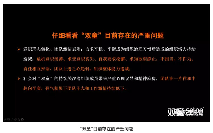本次改革早在幾個(gè)月前,樓仲平就組織管理層進(jìn)行深度反思,對(duì)“雙童”近幾年工作進(jìn)行總結(jié)梳理,找出“雙童”近三年以來(lái)存在的問(wèn)題,比如: