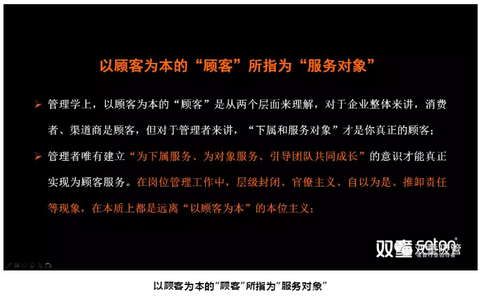 管理學(xué)上,以顧客為本的“顧客”所指為“服務(wù)對(duì)象”。對(duì)于企業(yè)整體來(lái)講,消費(fèi)者、渠道商是顧客,但對(duì)于管理者來(lái)講,“下屬和服務(wù)對(duì)象”才是你真正的顧客,一線員工才是你真正的顧客。給你發(fā)工資的不是老板,而是你的下屬,你的服務(wù)對(duì)象,是我們的“一線員工”在給管理者發(fā)工資!