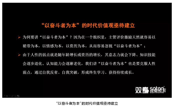 為什么要以“奮斗者為本”?由于人性的弱點(diǎn)就是隨年齡增長(zhǎng)或資歷的增長(zhǎng),其意志力就會(huì)下降、知識(shí)技能會(huì)逐步退化、認(rèn)知能力會(huì)逐漸老化,我們講“以?shī)^斗者為本”也是要克服人性弱點(diǎn),通過(guò)自我反省、自我突破,形成終生學(xué)習(xí)、獲得持續(xù)成長(zhǎng)!