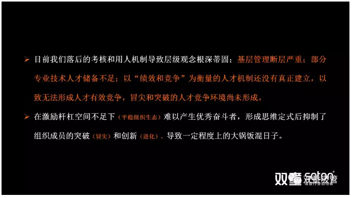 “雙童”原來(lái)落后的考核制度已經(jīng)形成了慣性,從而導(dǎo)致我們落后的考核和用人機(jī)制,導(dǎo)致基層管理斷層,部分專業(yè)技術(shù)人員儲(chǔ)備不足,以績(jī)效和競(jìng)爭(zhēng)為衡量人才機(jī)制的這樣一種模式還沒(méi)有真正建立,以至無(wú)法形成人才有效競(jìng)爭(zhēng)。