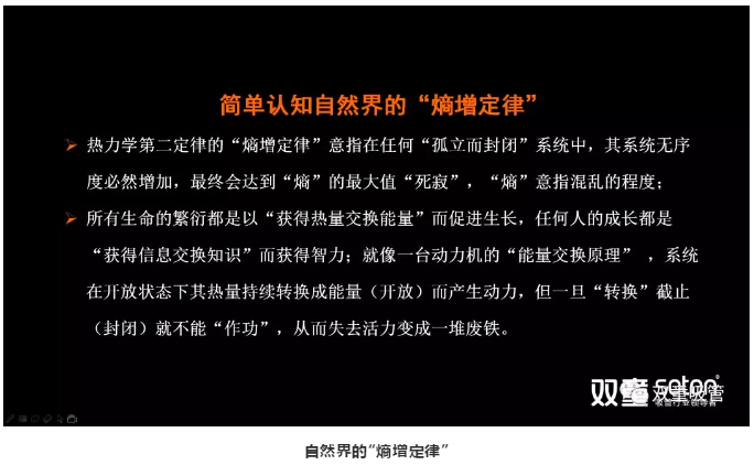 “熵增定律”意指在任何“孤立而封閉”系統(tǒng)中,其系統(tǒng)無(wú)序度必然增加,最終會(huì)達(dá)到“熵”的最大值“死寂”。任何一個(gè)人,任何一個(gè)組織,乃至于任何一個(gè)家庭,如果你把自己封閉起來(lái),你的內(nèi)部一定是從有序到無(wú)序。如果你繼續(xù)封閉,它的混亂程度一定會(huì)達(dá)到最大值,一直到死寂。