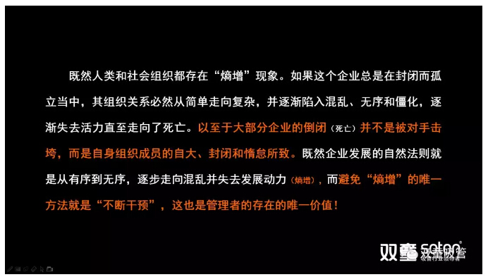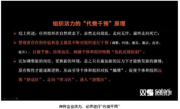 而避免“熵增”的唯一方法就是持續(xù)開(kāi)放和組織干預(yù),從而打破平衡,持續(xù)加壓、刺激個(gè)體和組織喚醒“危機(jī)反饋機(jī)制”,這也是管理者的存在的唯一價(jià)值!