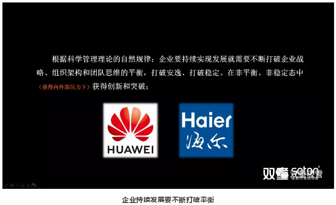 接下來(lái),樓仲平用華為及海爾的案例,引導(dǎo)大家認(rèn)知:企業(yè)要持續(xù)實(shí)現(xiàn)發(fā)展就需要不斷打破企業(yè)戰(zhàn)略、組織架構(gòu)和團(tuán)隊(duì)思維的平衡,打破安逸、打破穩(wěn)定、在非平衡、非穩(wěn)定態(tài)中(獲得內(nèi)外部壓力下)獲得創(chuàng)新和突破!