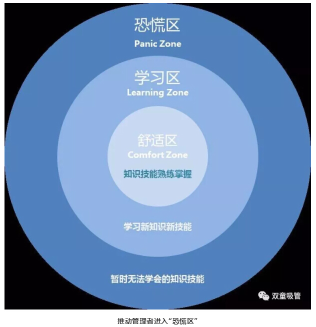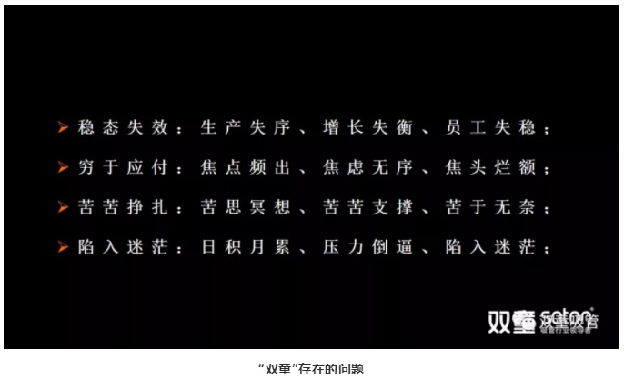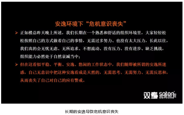 由于社會(huì)環(huán)境的復(fù)雜性、時(shí)代的巨變性和企業(yè)的自然墮變性,當(dāng)家人樓仲平意識(shí)到“雙童” 直面“生死劫”!隨即通過(guò)“向死而生”的命題假設(shè),讓團(tuán)隊(duì)認(rèn)知到雙童離“死亡”只有六個(gè)月,以此激發(fā)員工的危機(jī)感,從而讓“雙童”管理層再次脫離“舒適區(qū)”,遠(yuǎn)離“危險(xiǎn)區(qū)”,進(jìn)入“恐慌區(qū)”!通過(guò)對(duì)“死”的反悟,激發(fā)組織活力,從而得以延續(xù)獲得“生”的能力。