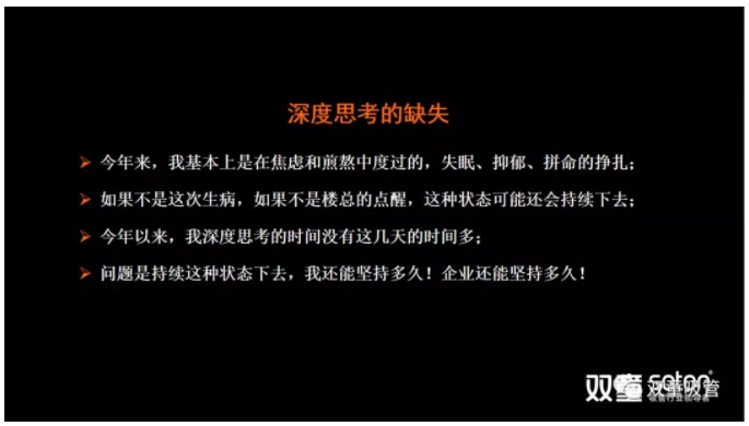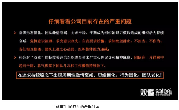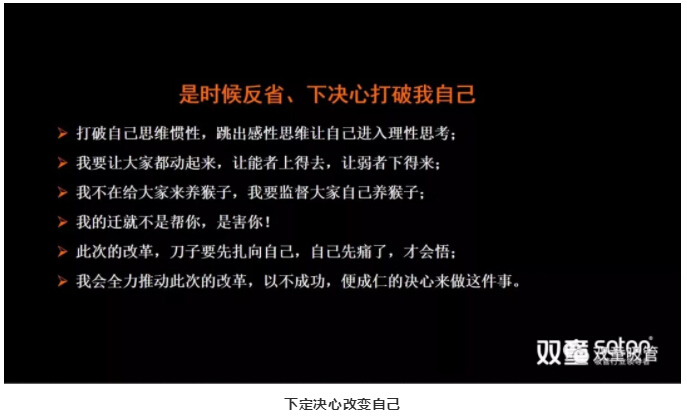 “所以是時(shí)候反省,并下決心打破自己!打破自己的思維慣性,跳出感性思維進(jìn)入理性思考,勇于突破和改變自我,下定決心再次推動(dòng)‘雙童’改革。”