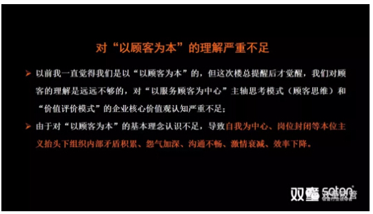 近些年來(lái),“雙童”人沒(méi)有形成“以服務(wù)顧客為中心”的主軸思考模式,對(duì)顧客思維的認(rèn)知嚴(yán)重不足。導(dǎo)致以自我為中心、崗位封閉的情況存在,從而使得組織內(nèi)部矛盾越積越深。