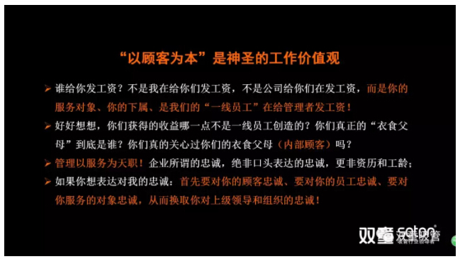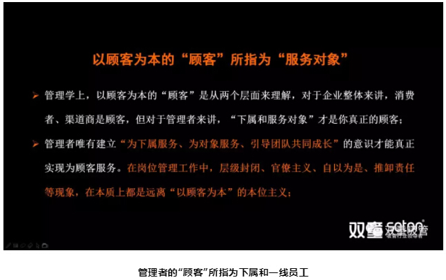 管理學(xué)上,以顧客為本的“顧客”所指為“服務(wù)對(duì)象”。對(duì)于企業(yè)整體來(lái)講,消費(fèi)者、渠道商是顧客,但對(duì)于管理者來(lái)講,“下屬和服務(wù)對(duì)象”才是你真正的顧客,一線員工才是你真正的顧客。給你發(fā)工資的不是老板,而是你的下屬,你的服務(wù)對(duì)象,是我們的“一線員工”在給管理者發(fā)工資!