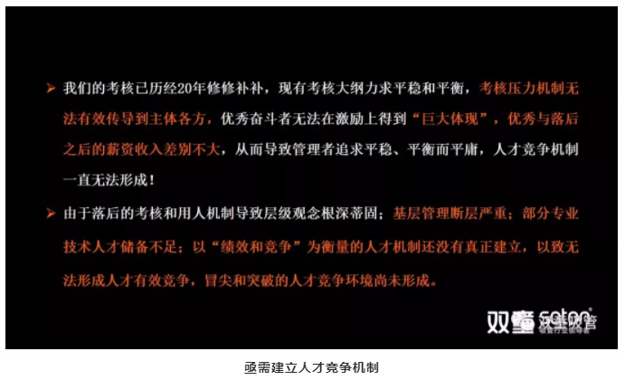 近兩天的改革,激發(fā)出了大家思維的活躍性,但改革不是短期的事情,要讓思維活躍性得到持續(xù),就需要建立起組織榮辱觀,通過(guò)全方位多渠道的文化宣傳,讓所有人感受到壓力,讓所有人參與其中,激發(fā)全體員工的積極性和能動(dòng)性。