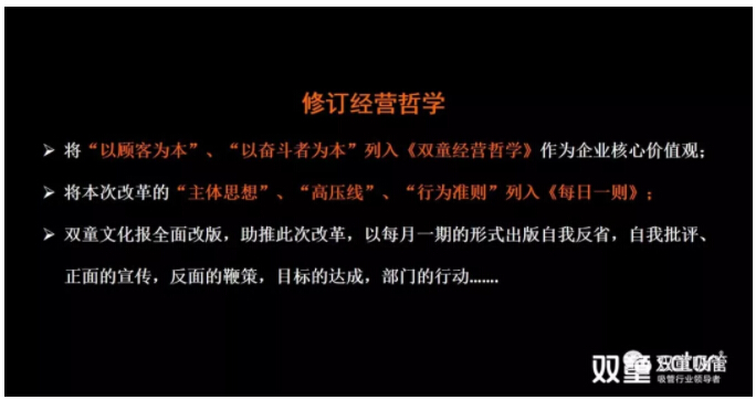 將“以顧客為本”、“以?shī)^斗者為本”、“管理者以一線員工為本”列入《雙童經(jīng)營(yíng)哲學(xué)》作為企業(yè)核心價(jià)值觀; 將本次改革的“主體思想”、“高壓線”、“行為準(zhǔn)則”列入《每日一則》; 雙童文化報(bào)全面改版,助推此次改革,以每月一期的形式出版自我反省,自我批評(píng)、正面的宣傳,反面的鞭策,目標(biāo)的達(dá)成,部門(mén)的行動(dòng)…….