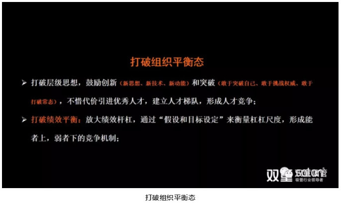 打破層級(jí)思想,鼓勵(lì)創(chuàng)新(新思想、新技術(shù)、新動(dòng)能)和突破(敢于突破自己、敢于挑戰(zhàn)權(quán)威、敢于打破常態(tài)),不惜代價(jià)引進(jìn)優(yōu)秀人才,建立人才梯隊(duì),形成人才競(jìng)爭(zhēng); 打破績(jī)效平衡:放大績(jī)效桿杠,通過(guò)“假設(shè)和目標(biāo)設(shè)定”來(lái)衡量杠杠尺度,形成能者上,弱者下的競(jìng)爭(zhēng)機(jī)制;