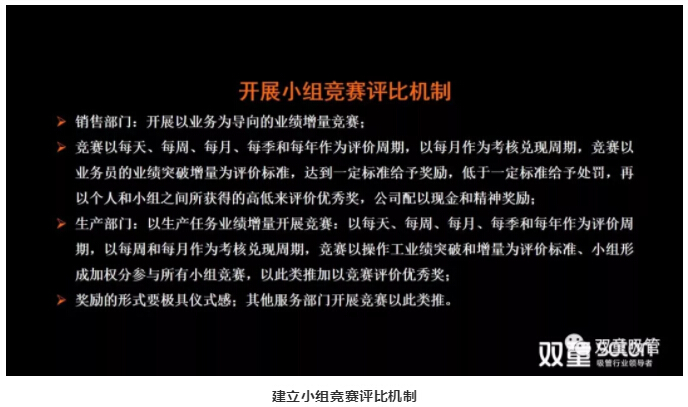 銷(xiāo)售部門(mén):以業(yè)務(wù)為導(dǎo)向的業(yè)績(jī)?cè)隽扛?jìng)賽;競(jìng)賽以每天、每周、每月、每季和每年作為評(píng)價(jià)周期,以每月作為考核兌現(xiàn)周期,競(jìng)賽以業(yè)務(wù)員的業(yè)績(jī)突破增量為評(píng)價(jià)標(biāo)準(zhǔn),達(dá)到一定標(biāo)準(zhǔn)給予獎(jiǎng)勵(lì),低于一定標(biāo)準(zhǔn)給予處罰,再以個(gè)人和小組之間所獲得的高低來(lái)評(píng)價(jià)優(yōu)秀獎(jiǎng),公司配以現(xiàn)金和精神獎(jiǎng)勵(lì); 生產(chǎn)部門(mén):以生產(chǎn)任務(wù)業(yè)績(jī)?cè)隽块_(kāi)展競(jìng)賽;以每天、每周、每月、每季和每年作為評(píng)價(jià)周期,以每周和每月作為考核兌現(xiàn)周期,競(jìng)賽以操作工業(yè)績(jī)突破和增量為評(píng)價(jià)標(biāo)準(zhǔn)、小組形成加權(quán)分參與所有小組競(jìng)賽,以此類(lèi)推加以競(jìng)賽評(píng)價(jià)優(yōu)秀獎(jiǎng);獎(jiǎng)勵(lì)的形式要極具儀式感;其他服務(wù)部門(mén)開(kāi)展競(jìng)賽以此類(lèi)推。