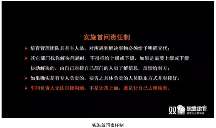 培育管理團(tuán)隊(duì)具有主人翁,對(duì)所遇到解決事物必須給予明確交代; 其它部門(mén)找你解決問(wèn)題時(shí),不得推給上級(jí)或下級(jí),如果是需要上級(jí)或下級(jí)協(xié)助解決的,由自己對(duì)接自己部門(mén)的人員了解信息,反饋給對(duì)方; 如果確實(shí)是有專(zhuān)人負(fù)責(zé)的,要告之具體負(fù)責(zé)的人員聯(lián)系方式并對(duì)接好;車(chē)間負(fù)責(zé)人無(wú)法直接溝通,不是讓找上面,就是讓自己去現(xiàn)場(chǎng)看。
