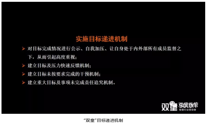 目前,公司目標(biāo)完成情況沒(méi)有公示,大部分人對(duì)目標(biāo)進(jìn)度都不了解。后續(xù)“雙童”也將建立明確的目標(biāo)未完成干預(yù)機(jī)制和健全的重大目標(biāo)事項(xiàng)未完成責(zé)任追究機(jī)制,將責(zé)任追究到人,壓力分?jǐn)偟饺耍瑥亩鴮?shí)現(xiàn)反向激勵(lì),讓所有成員發(fā)揮最大的能力實(shí)現(xiàn)目標(biāo)。