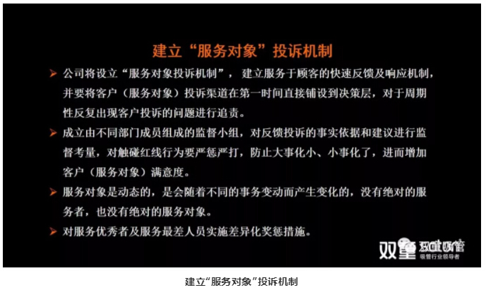 公司將設(shè)立“服務(wù)對(duì)象投訴機(jī)制”, 建立服務(wù)于顧客的快速反饋及響應(yīng)機(jī)制,并要將客戶(hù)(服務(wù)對(duì)象)投訴渠道在第一時(shí)間直接鋪設(shè)到?jīng)Q策層,對(duì)于周期性反復(fù)出現(xiàn)客戶(hù)投訴的問(wèn)題進(jìn)行追責(zé)。 成立由不同部門(mén)成員組成的監(jiān)督小組,對(duì)反饋投訴的事實(shí)依據(jù)和建議進(jìn)行監(jiān)督考量,對(duì)觸碰紅線行為要嚴(yán)懲嚴(yán)打,防止大事化小、小事化了,進(jìn)而增加客戶(hù)(服務(wù)對(duì)象)滿(mǎn)意度。 服務(wù)對(duì)象是動(dòng)態(tài)的,是會(huì)隨著不同的事務(wù)變動(dòng)而產(chǎn)生變化的,沒(méi)有絕對(duì)的服務(wù)者,也沒(méi)有絕對(duì)的服務(wù)對(duì)象。對(duì)服務(wù)優(yōu)秀者及服務(wù)最差人員實(shí)施差異化獎(jiǎng)懲措施。