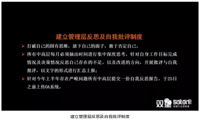 打破自己的固有思維,放下自己的面子,敢于否定自己。 所有中高層每月必須抽出時(shí)間進(jìn)行集中深度思考,針對(duì)自身工作目標(biāo)完成情況及決策情況反思自己存在的不足,以及改進(jìn)的方向,開(kāi)展批評(píng)與自我批評(píng),以文字的形式進(jìn)行匯總上報(bào); 針對(duì)今年上半年存在嚴(yán)峻問(wèn)題所有中高層提交一份自我反思報(bào)告,于25日之前上傳OA系統(tǒng)。
