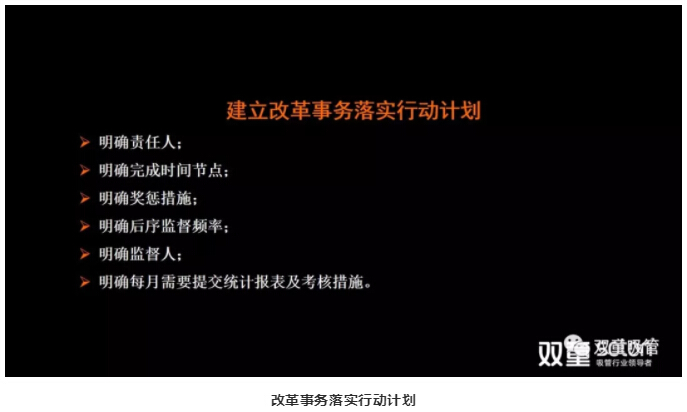 “雙童”將建立起改革事務(wù)落實(shí)行動(dòng)計(jì)劃,明確各項(xiàng)指標(biāo),并定立相應(yīng)的考核措施,要求所有人每月將報(bào)表上交財(cái)務(wù),直接與工資掛鉤,確保每個(gè)人都行動(dòng)起來(lái),確保改革事務(wù)貫徹落實(shí)。