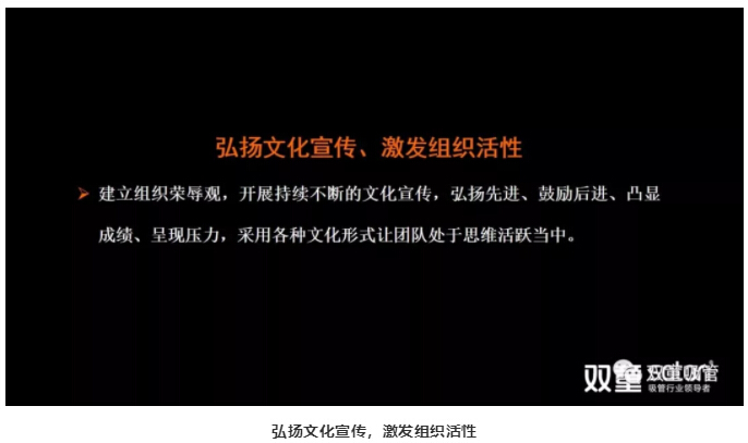 建立組織榮辱觀,開(kāi)展持續(xù)不斷的文化宣傳,弘揚(yáng)先進(jìn)、鼓勵(lì)后進(jìn)、凸顯成績(jī)、呈現(xiàn)壓力,采用各種文化形式讓團(tuán)隊(duì)處于思維活躍當(dāng)中。