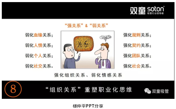 樓仲平則十分注重關(guān)系哲學(xué),他認為一個人的能力是有限的,能發(fā)展的強關(guān)系范圍也就只有十來個人,在企業(yè)經(jīng)營中,十多個人的作用并不大!在企業(yè)內(nèi)部要弱化血緣關(guān)系,強化規(guī)則關(guān)系;弱化人情關(guān)系,強化契約關(guān)系;弱化個人關(guān)系,強化團隊關(guān)系;弱化社交關(guān)系,強化社會關(guān)系。
