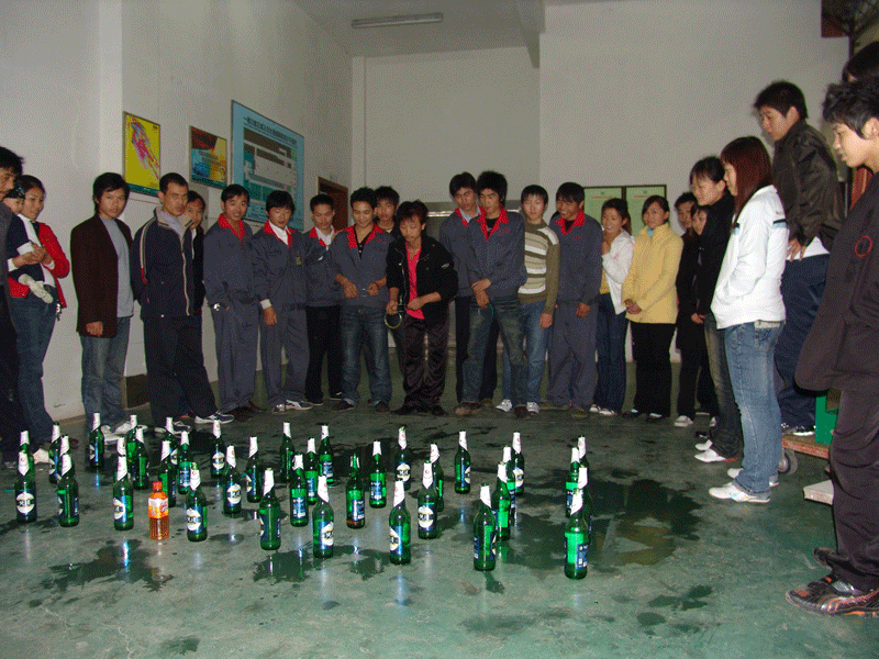 還有倒水和套圈圈比賽:倒水比賽為按照規(guī)定高度在啤酒瓶內(nèi)倒水,倒?jié)M啤酒瓶用時(shí)最少者勝出,套圈圈比賽為每人10個(gè)圈,套中數(shù)量最多者勝出。