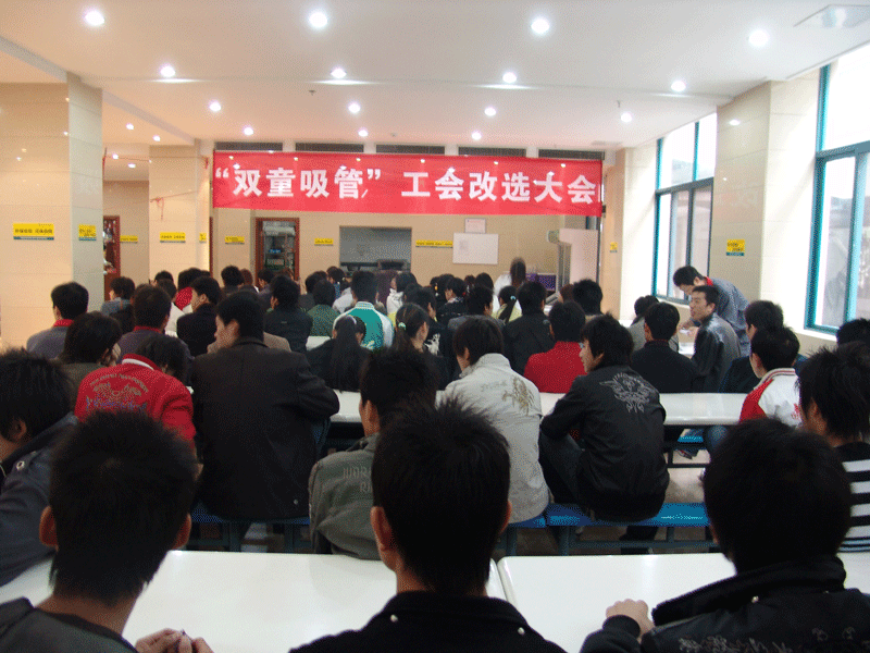 2007年11月16日下午,公司召集全體員工在公司食堂召開工會改選大會,會議由工會主席張國俊副總主持,張主席對公司從2002年12月1日工會成立以來工會所做工作向全體員工進(jìn)行了詳細(xì)的報(bào)告。因?yàn)槿藛T有所變動(dòng),按照工會法規(guī)定5年一屆的工會需要重新進(jìn)行改選,張主席對工會法和工會代表選舉規(guī)程做了介紹,通過上午的職工代表大會選舉產(chǎn)生76名代表,大會一致通過由76名職工代表擔(dān)任工會代表。并表示對次名單進(jìn)行公布3天,如果有異議的還可以向工會提出意見。