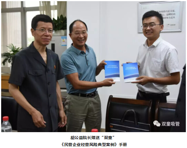 會(huì)上,胡公益院長(zhǎng)也向樓仲平了解企業(yè)生產(chǎn)經(jīng)營(yíng)過(guò)程中的司法需求,并贈(zèng)送《民營(yíng)企業(yè)經(jīng)營(yíng)風(fēng)險(xiǎn)典型案例》手冊(cè)。同時(shí),“雙童”樓仲平也對(duì)胡公益院長(zhǎng)一行人的親自到訪、上門(mén)服務(wù)及贈(zèng)送《民營(yíng)企業(yè)經(jīng)營(yíng)風(fēng)險(xiǎn)典型案例》手冊(cè)表示十分感謝!