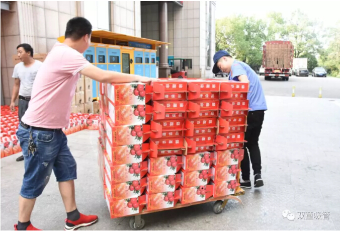 厲害了“雙童”人!有些部門的同事們直接拉著車把本部門的獎品全領(lǐng)啦!每個員工一箱石榴、一盒月餅。