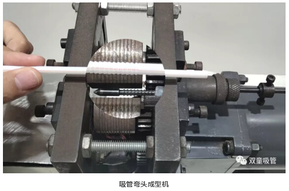 再通過這臺(tái)彎頭成型機(jī),將擠出的直吸管放入其中,壓出折彎波紋。