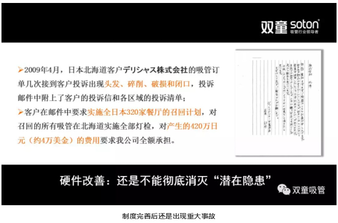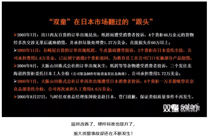 但廁所改善了,生產(chǎn)環(huán)境優(yōu)化了,硬件標(biāo)準(zhǔn)也提升了,重大質(zhì)量事故卻還在不斷發(fā)生!前前后后七八年的時(shí)間里,“雙童”在日本市場(chǎng)栽了不少“跟頭”,虧損了大量資金,在這樣的情況下,選擇“死磕”還是“放棄”?