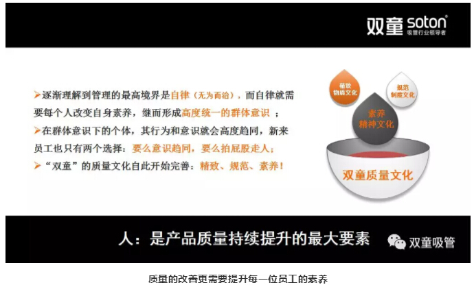 堅(jiān)持或放棄僅一念之差,一秒鐘就可以放棄,但放棄了就沒(méi)有今天的“雙童“!最終,“雙童”選擇了持續(xù)“死磕”!這個(gè)過(guò)程中,“雙童”逐漸認(rèn)知到,質(zhì)量管理體系建設(shè),除了硬件之外,還需要制度化管理。