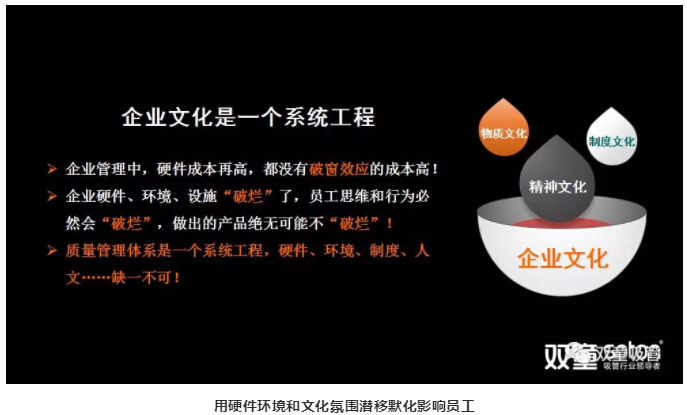 通過(guò)對(duì)環(huán)境和制度的不斷改善,我們認(rèn)知到:質(zhì)量的改善僅有硬件和制度是不夠的,更需要不斷提升每一位員工的素養(yǎng),形成高度統(tǒng)一的群體意識(shí) 。自此,“雙童”質(zhì)量文化開(kāi)始逐步完善,通過(guò)硬件環(huán)境和文化氛圍潛移默化地影響員工,用精細(xì)化管理的方式改變員工的意識(shí)和習(xí)慣。