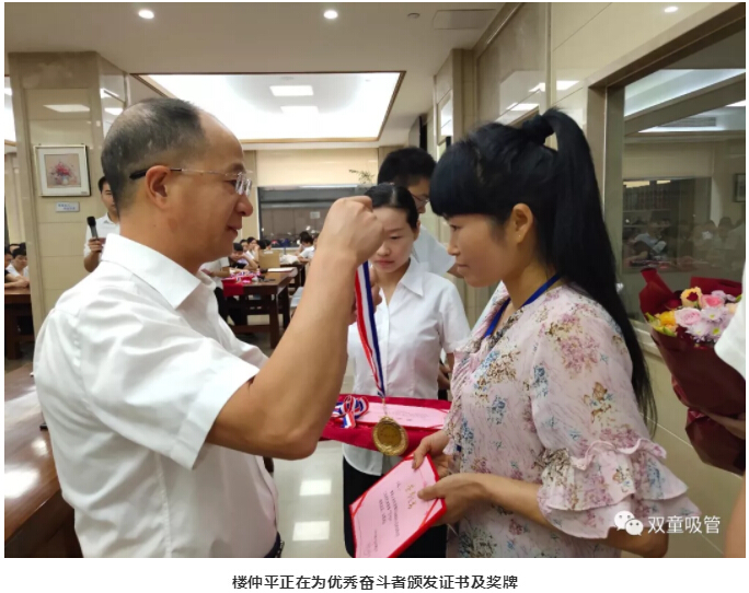 樓仲平正在為優(yōu)秀奮斗者頒發(fā)證書及獎牌