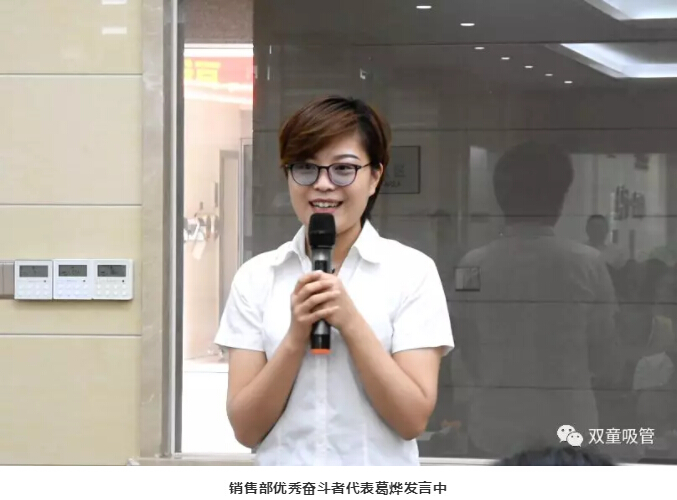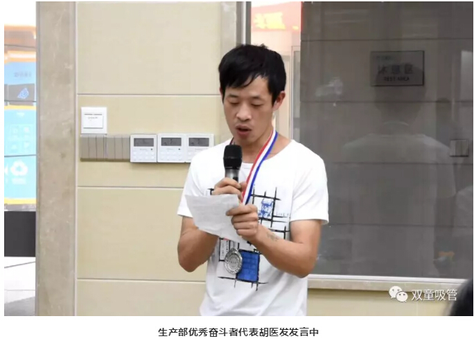 在表彰儀式后,來自銷售部及生產(chǎn)部的兩位優(yōu)秀奮斗者代表葛燁與胡醫(yī)發(fā)進行了發(fā)言,他們紛紛表示:很高興能夠遇見“雙童”,遇見“雙童”的改革,這一次所獲得的獎勵,不僅僅是榮譽上,更是公司對我們工作的認同與肯定,在接下去的工作中,也將再接再厲,努力做到更好,也希望下一次能夠再次走上這個舞臺。