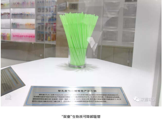 緊接著,來到可降解吸管展示區(qū)時,"雙童"樓仲平先向大家介紹了45天就可以化解成水和二氧化碳的“雙童”PLA生物質(zhì)可降解吸管。