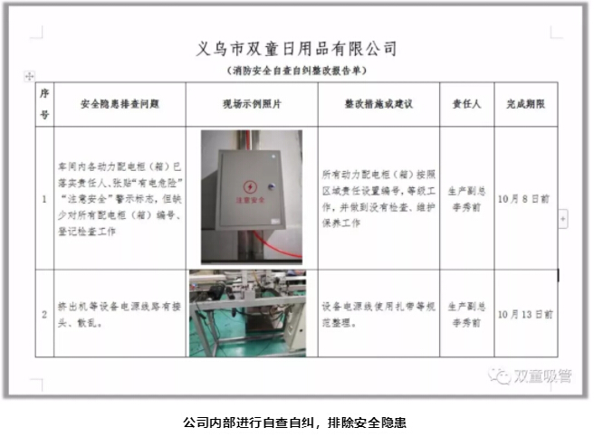 此次重大火災(zāi)事故發(fā)生后,瞬間引發(fā)了“雙童”強(qiáng)烈危機(jī)感,所有“雙童”人深刻意識到安全的重要性!安全工作已經(jīng)迫在眉睫,雖然事故發(fā)生后恰逢國慶員工放假期間,“雙童”安全工作也在緊鑼密鼓的開展,廠區(qū)內(nèi)安排了值班人員,每天開展安全排查等工作,進(jìn)行自查自糾,并邀請專家到公司做安全指導(dǎo)工作。“雙童”在安全排查期間,共計發(fā)現(xiàn)了39項安全隱患,明確責(zé)任人和改進(jìn)期限,杜絕安全隱患!