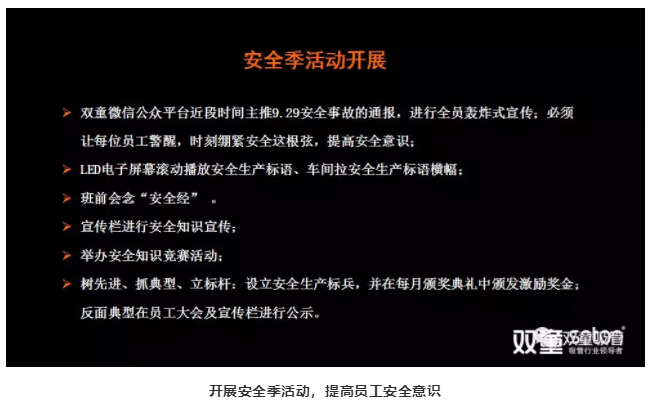 最后,李講師講道:在接下來(lái)三個(gè)月的安全季中,“雙童”也將開(kāi)展安全季活動(dòng),以各種形式進(jìn)行宣傳“安全”的重要性,讓每位員工警醒,時(shí)刻繃緊安全這根弦,提高安全意識(shí)!