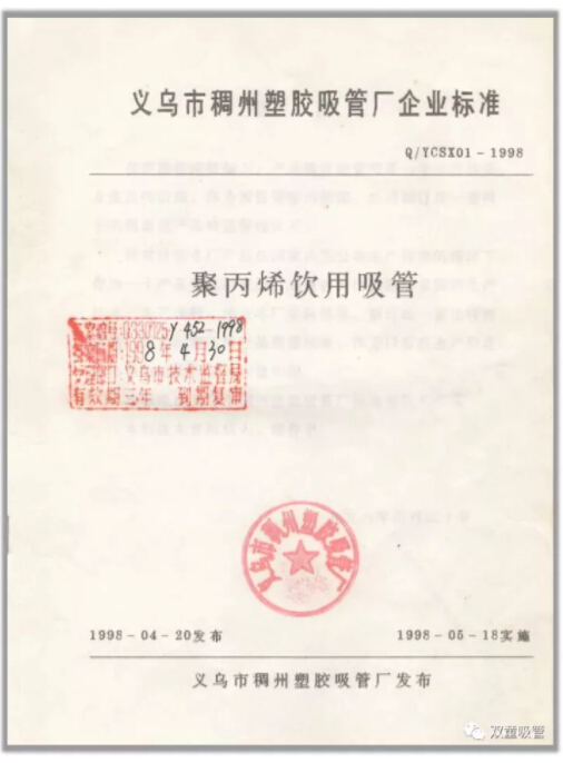 終于,在1997年10月,由“雙童”前身義烏市稠州塑膠吸管廠起草的Q/YCSX01《聚丙烯飲用吸管》企業(yè)標(biāo)準(zhǔn)審核通過,于1998年4月正式發(fā)布,成為吸管行業(yè)最早的產(chǎn)品標(biāo)準(zhǔn)。