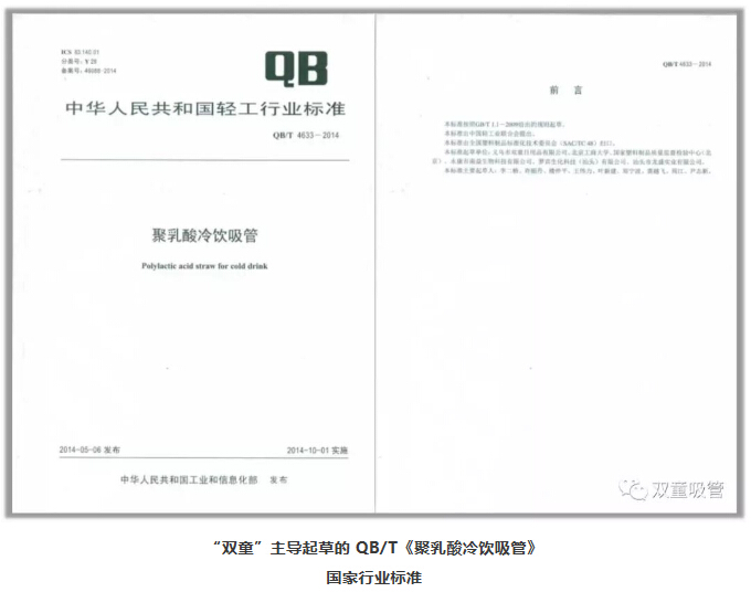 所以在2011年,“雙童”便上報國家標準化委員會,推動編制起草了《聚乳酸冷飲吸管》國家行業(yè)標準,于2013年4月通過《聚乳酸冷飲吸管》行業(yè)標準的審核工作。在2014年,由“雙童”主導(dǎo)起草的 QB/T 4633-2014《聚乳酸冷飲吸管》國家行業(yè)標準正式發(fā)布并實施。本次標準的制訂將推動環(huán)境友好型的生物質(zhì)可降解產(chǎn)品逐步替代傳統(tǒng)塑料吸管,并致力于消除塑料產(chǎn)品帶來的白色污染。