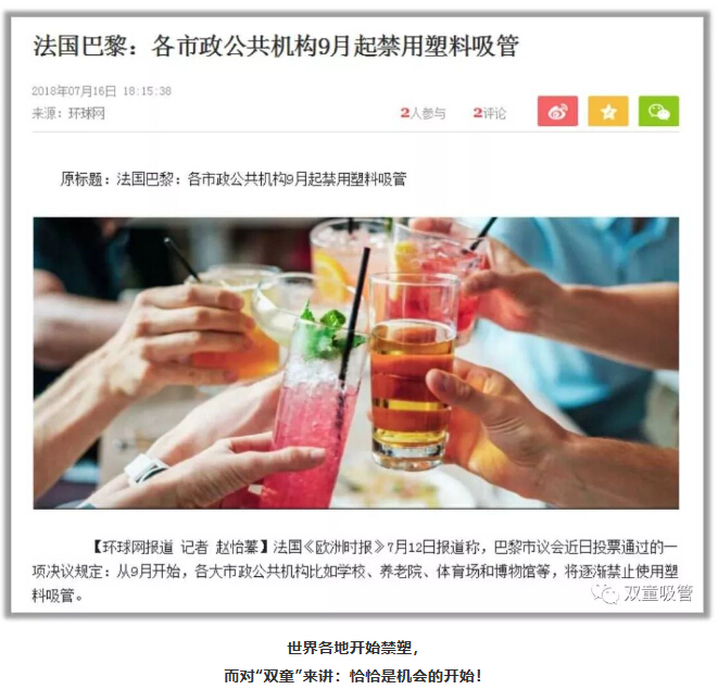 由于塑料吸管難以反復(fù)利用,隨之而產(chǎn)生的白色污染給環(huán)境帶來了巨大的傷害,引發(fā)了越來越多人的關(guān)注!近年來,全球多地政府掀起“限塑”熱潮,至此,“雙童”意識到:塑料產(chǎn)業(yè)面臨徹底顛覆,吸管產(chǎn)品的行業(yè)革命已經(jīng)來襲!