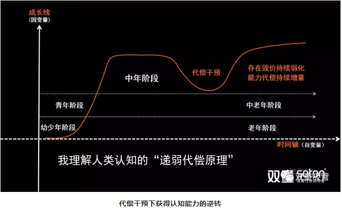 所以,我用一個(gè)“認(rèn)知能力”思維模型給大家說(shuō)明:人類(lèi)發(fā)展中的成長(zhǎng)性是能夠無(wú)窮拓展的。比如正常來(lái)講,看一個(gè)人的認(rèn)知能力,從幼年、少年、青年,到中年處于一個(gè)鼎盛階段,到中老年階段之后就進(jìn)入到自然遞減的過(guò)程。