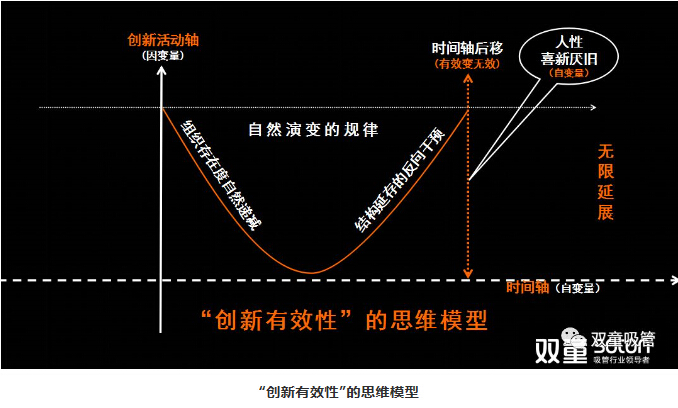 由此可以推導(dǎo)出,創(chuàng)新是創(chuàng)業(yè)活動(dòng)的前提,是不得不為之的“生存干預(yù)”。在這個(gè)干預(yù)過(guò)程當(dāng)中大家要理解,它某種程度上是滿(mǎn)足人性的底層,它有一個(gè)不變的規(guī)律就是在時(shí)間軸后移的情況下創(chuàng)新有效變無(wú)效,所以創(chuàng)新是一個(gè)無(wú)限延展的過(guò)程。
