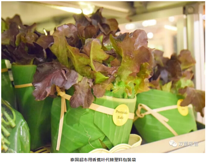 塑料袋在我們生活當(dāng)中使用量巨大,超市購(gòu)物、菜場(chǎng)買菜都需要用到大量的塑料袋,但這可難不倒各位環(huán)保人士。瞧!泰國(guó)超市就用上了純天然的“包裝袋”!
