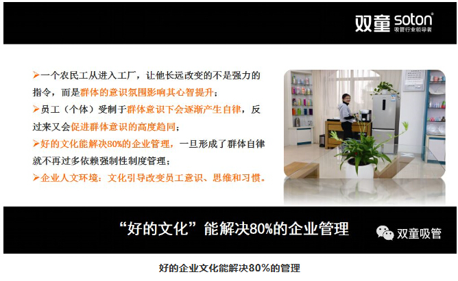 作為一個(gè)企業(yè)來說,企業(yè)的內(nèi)核是企業(yè)文化和組織思維。企業(yè)文化分為顯性文化和隱性文化。“雙童”的花園式工廠、綠化環(huán)境、文化標(biāo)語等都是表面的顯性文化。