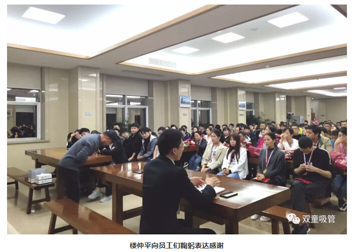 樓仲平三鞠躬感謝基層員工 表彰大會開始后,“雙童”樓仲平再次為員工站臺,進行肺腑發(fā)言,并連續(xù)三鞠躬感謝基層員工: 一鞠躬:感謝口杯車間兩個班組的努力奮斗 “第一點,我每個月必然會參加員工表彰大會,除了出差趕不回來的突發(fā)狀況,一定會每個月給大家站臺。另外,我要求每月發(fā)放不少于二十萬優(yōu)秀員工獎金作為管理指標,我不參與任何評價和監(jiān)督,我相信時間長了團隊總得去琢磨這筆錢怎么給才公平合理,讓更多人能夠覺得自己受到尊重,我覺得這是改革的價值所在。