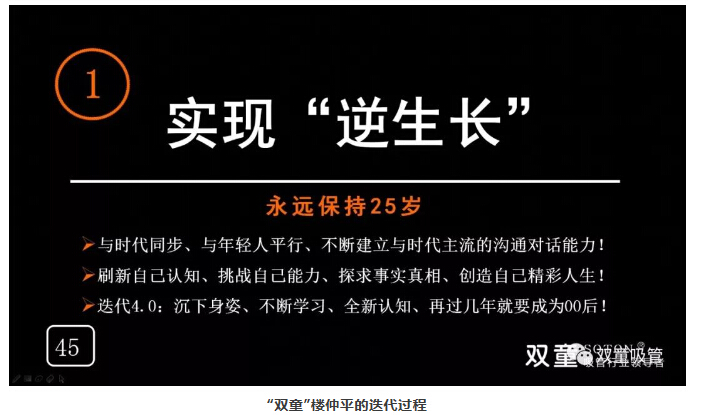 一直以來,“雙童”樓仲平都拒絕用“成功”一詞形容自己和“雙童”。他認(rèn)為企業(yè)和人是一樣的,只有成長,沒有成功!但是,由于隨年齡增長或資歷的增長,人的意志力就會下降、知識技能會逐步退化、認(rèn)知能力會逐漸老化。
