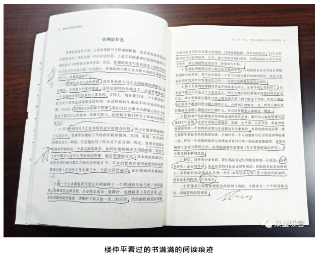 其實,樓仲平早在很多年前,就已經(jīng)開始閱讀現(xiàn)代管理學(xué)之父德魯克的書籍,他的書架上擺滿了德魯克的管理學(xué)著作。這些書籍經(jīng)過他反復(fù)閱讀,已經(jīng)畫滿了圈圈點點的筆記。