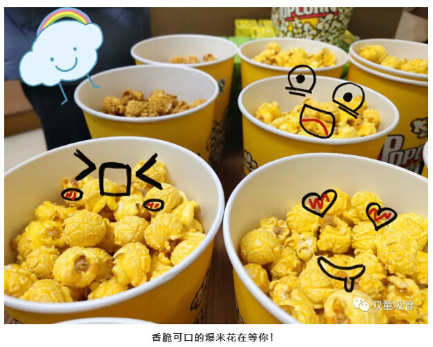 在“雙童”影院,不僅要看得過癮,也要吃得過癮!看電影標(biāo)配不能少,人手一桶爆米花!香噴噴,甜蜜蜜的爆米花有誰不愛呢?不一會(huì)兒,爆米花領(lǐng)取臺(tái)前就排起了長(zhǎng)龍!